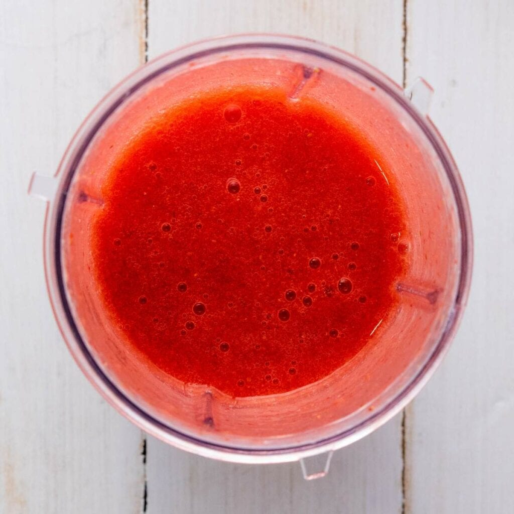 - While the syrup cools, blend fresh strawberries with a little water until smooth. For a more refined texture, strain the puree through a fine mesh sieve. You can skip this step if you prefer a slightly thicker lemonade. If you haven’t already, strain the lemon juice to remove seeds and excess pulp for a smoother result.